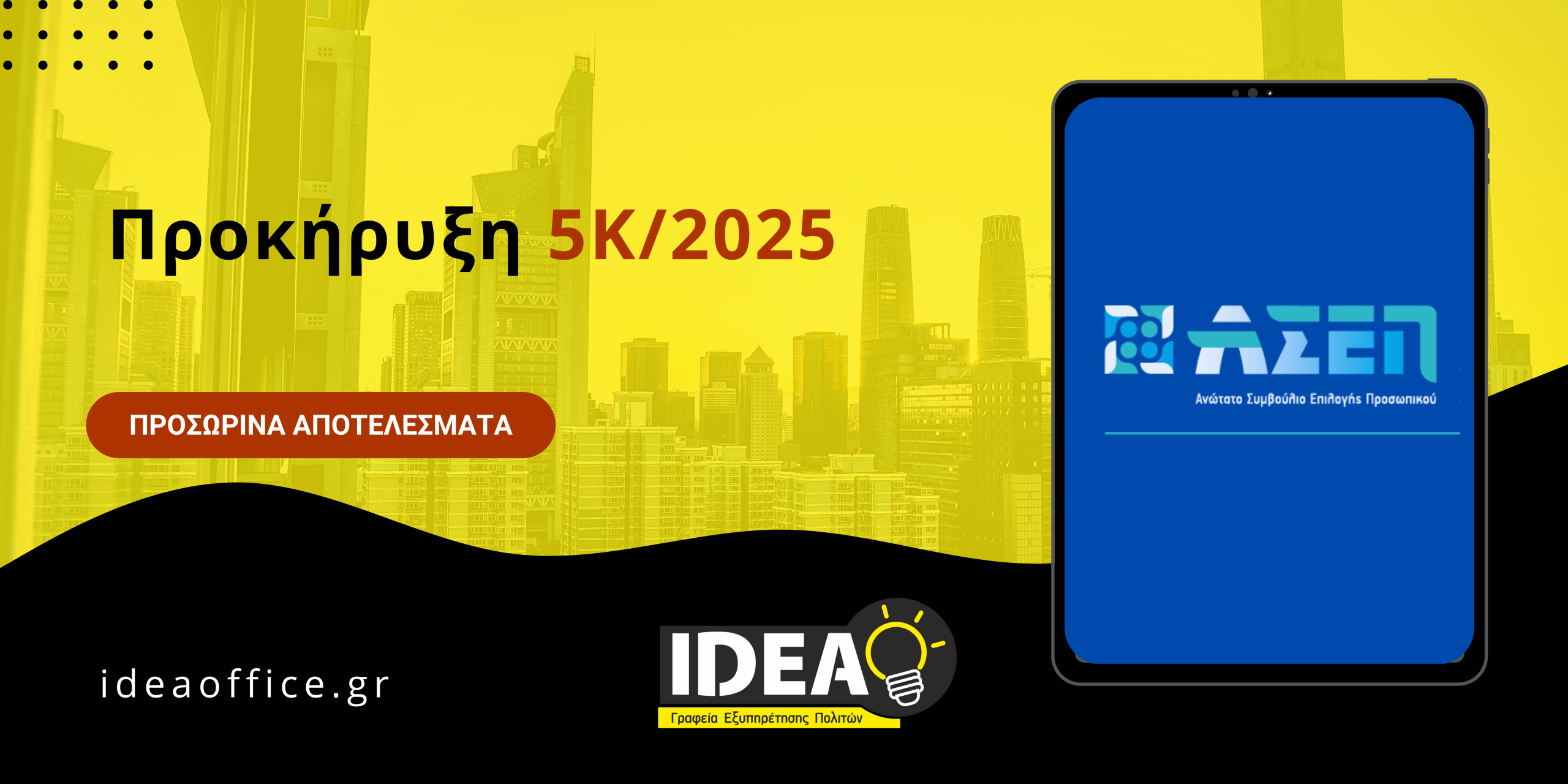 Σήμερα εκδόθηκαν και καταχωρίστηκαν στην ιστοσελίδα του ΑΣΕΠ τα προσωρινά αποτελέσματα της Προκήρυξης 5Κ/2025 (Φ.Ε.Κ. 48/12.09.2025/τ. Α.Σ.Ε.Π. ) που αφορoύν στην πλήρωση με σειρά προτεραιότητας, είκοσι (20) θέσεων προσωπικού με σχέση εργασίας Ιδιωτικού Δικαίου Αορίστου Χρόνου Πανεπιστημιακής, Τεχνολογικής και Δευτεροβάθμιας Εκπαίδευσης στη Ρυθμιστική Αρχή Αποβλήτων, Ενέργειας και Υδάτων (ΡΑΑΕΥ), σύμφωνα με το άρθρο 28 του ν. 4765/2021.