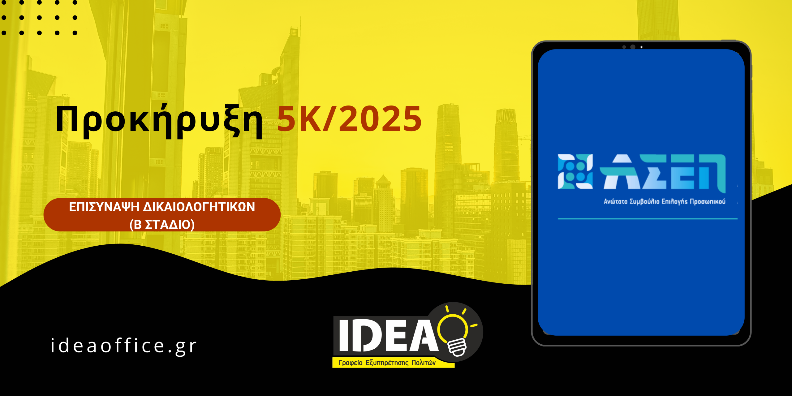 Προκειμένου να καταρτιστούν οι προσωρινοί πίνακες κατάταξης και διοριστέων της Προκήρυξης 5Κ/2025 του ΑΣΕΠ (Φ.Ε.Κ. 48/12.09.2025/τ. Α.Σ.Ε.Π.) που αφορά στην πλήρωση με σειρά προτεραιότητας είκοσι (20) θέσεων προσωπικού με σχέση εργασίας Ιδιωτικού Δικαίου Αορίστου Χρόνου Πανεπιστημιακής, Τεχνολογικής και Δευτεροβάθμιας Εκπαίδευσης στη Ρυθμιστική Αρχή Αποβλήτων, Ενέργειας και Υδάτων (ΡΑΑΕΥ)), σύμφωνα με το άρθρο 28 του ν. 4765/2021, το ΑΣΕΠ καλεί τους υποψηφίους που περιλαμβάνονται στους πίνακες της παρούσας Ανακοίνωσης, οι οποίοι, ανά κατηγορία και κλάδο/ειδικότητα, προηγούνται στους πίνακες κατάταξης με βάση τη συνολική τους βαθμολογία, σύμφωνα με τα δηλωθέντα στην ηλεκτρονική τους αίτηση στοιχεία, να υποβάλουν ηλεκτρονικά τα απαιτούμενα δικαιολογητικά, ακολουθώντας τις οδηγίες που παρέχονται στην Προκήρυξη.